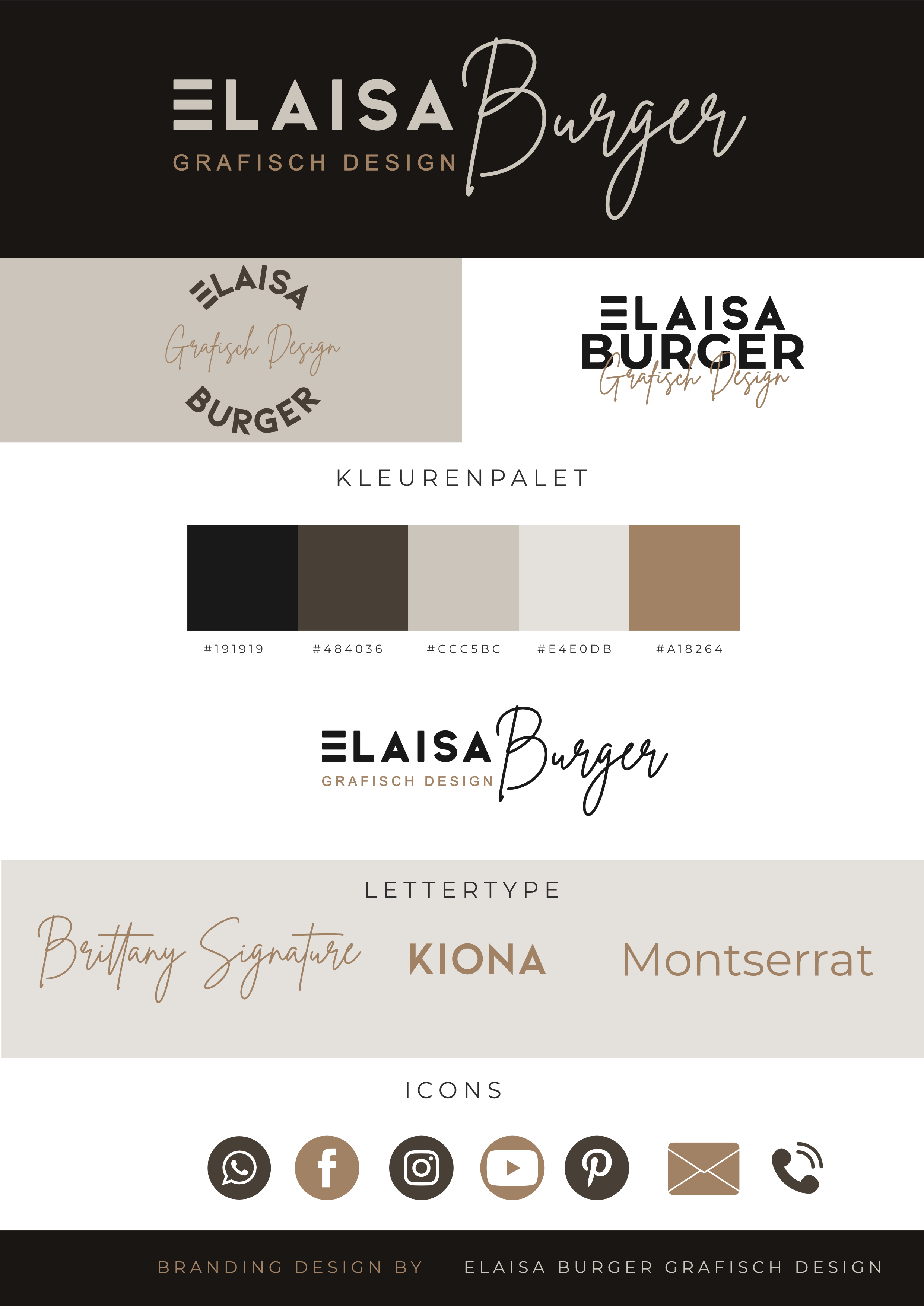 Als je dan zo met branding bezig bent, hoe leuk is het dan om je eigen brandingbord te maken. Het start met je eigen logo. Ik hou van het sierlijke letters gecombineerd met strakke letters. En de letter E van Elaisa zijn de drie strepen van het menu op je mobiel als je een website bezoekt op je mobiel. Een keer wilde ik daar de kleuren van aanpassen maar ik wist niet hoe dat moest. Want ik wist niet hoe dat heette. Todat ik het eindelijk vond. Het heet dus “burger” menu. Nou dat is toevallig mijn achternaam. Zo kwam ik op het idee om van de letter E drie horizontale streepjes te maken. Zie hieronder hoe mijn brandingbord eruit ziet.